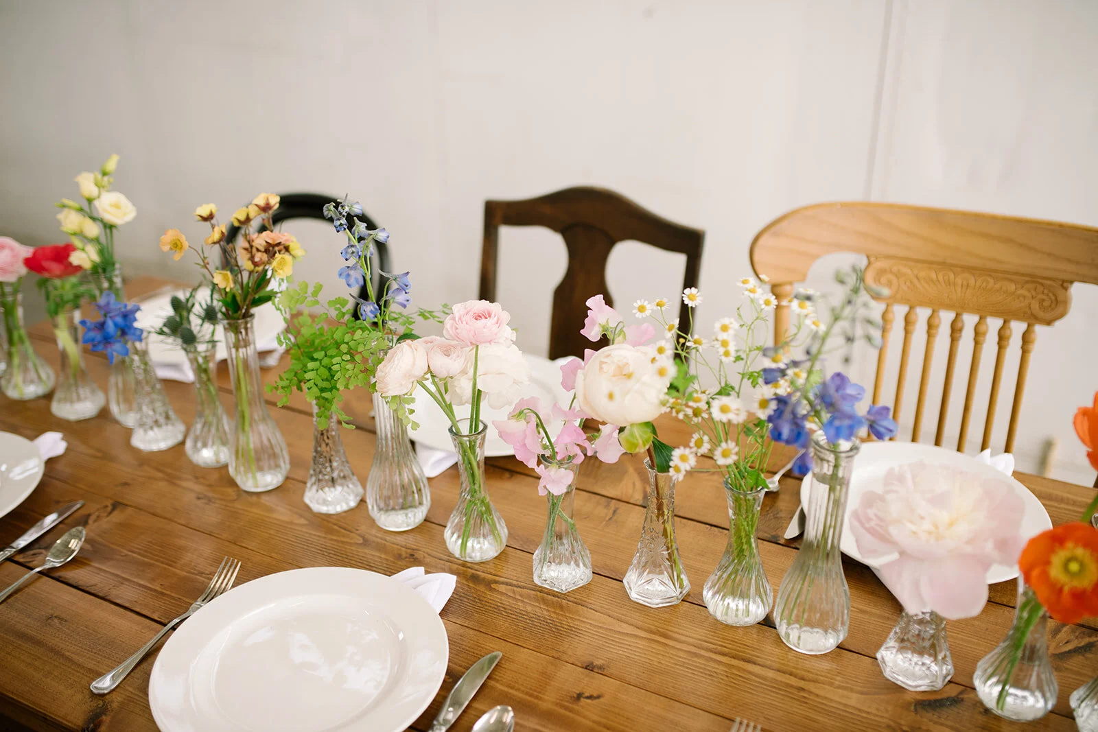 If you are considering booking a venue that can be described as a “Blank Space”, this is beautiful photographic proof of the role that florals can play in transforming the look and feel of your event. This winery reception featured minimalist table settings and bare walls, allowing the flowers to do the work of softening the feel and bringing in the colors and textures of spring. All flowers chosen were seasonal, locally grown, and picked at their peak to ensure their best performance on Kathryn and Brad’s Best Day.