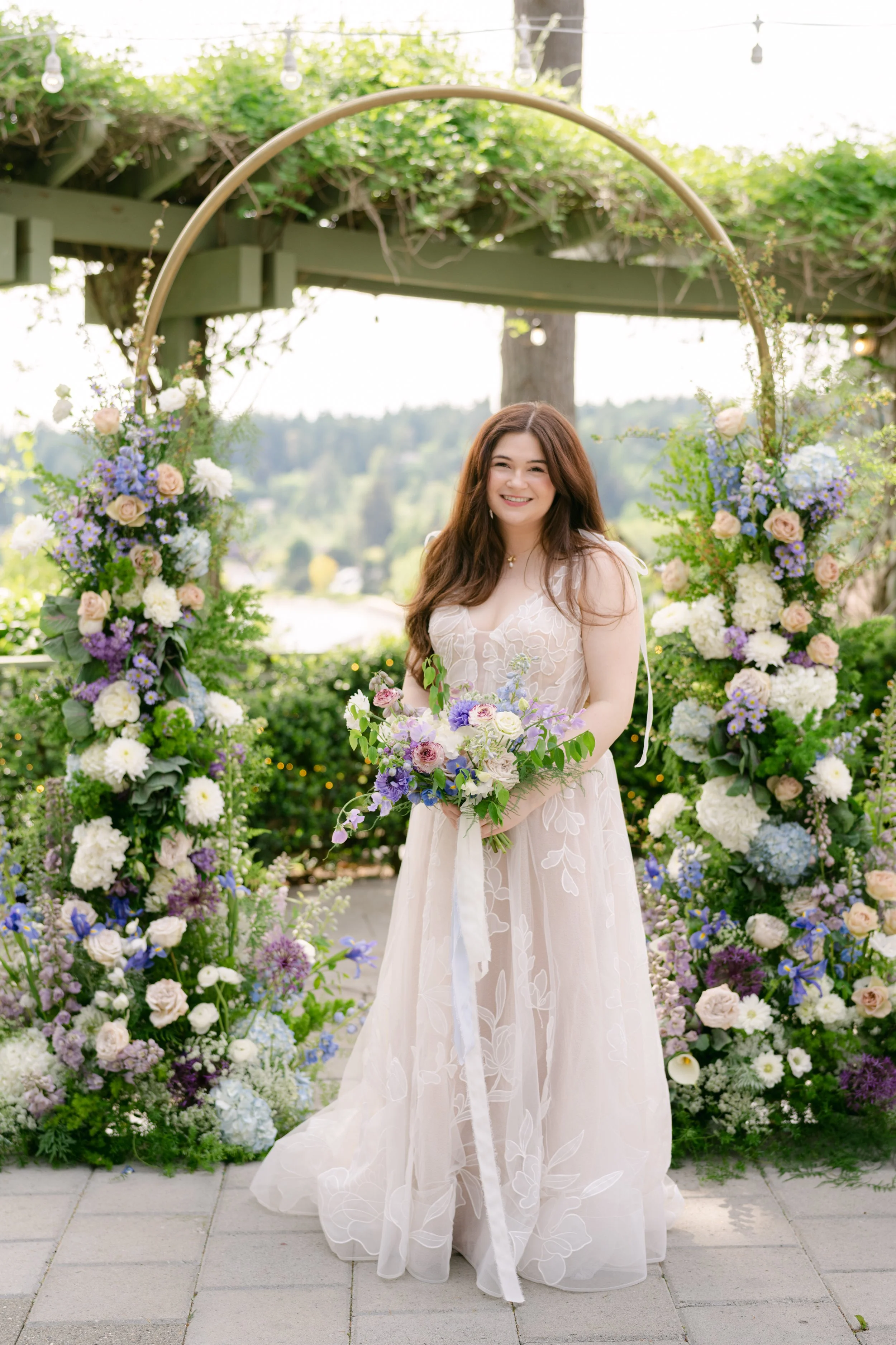 Classically styled, simple dark wood arbor. Cost includes set up and breakdown by floral team, which is required for rental. Final price is dependent on venue location and driving distance. Optional voile/chiffon fabric draping available as well; color choices include white, blush, black and burgundy. Only available to Full Service clients.